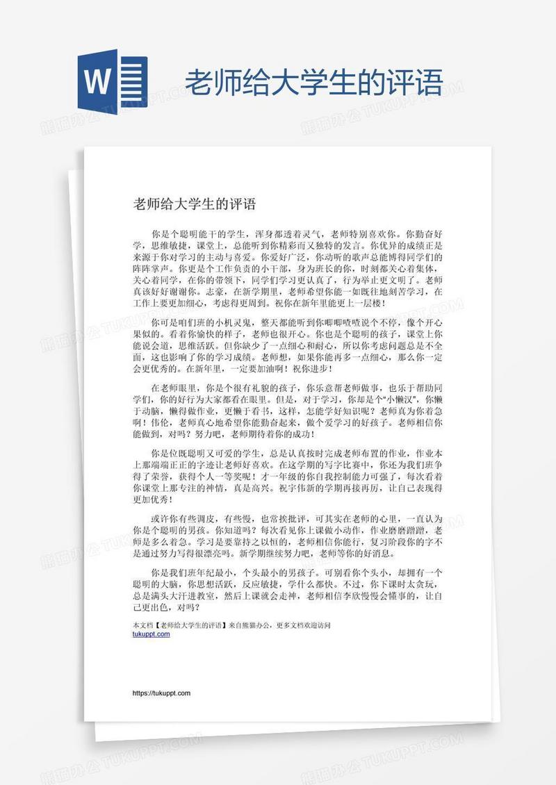 本作品为老师给大学生的评语, 编号:313eke8b69, 格式为 docx, 大小1 MB, 本作品下载后,先解压,解压之后用推荐软件 Word(2010) 打开, 然后进行编辑功能。