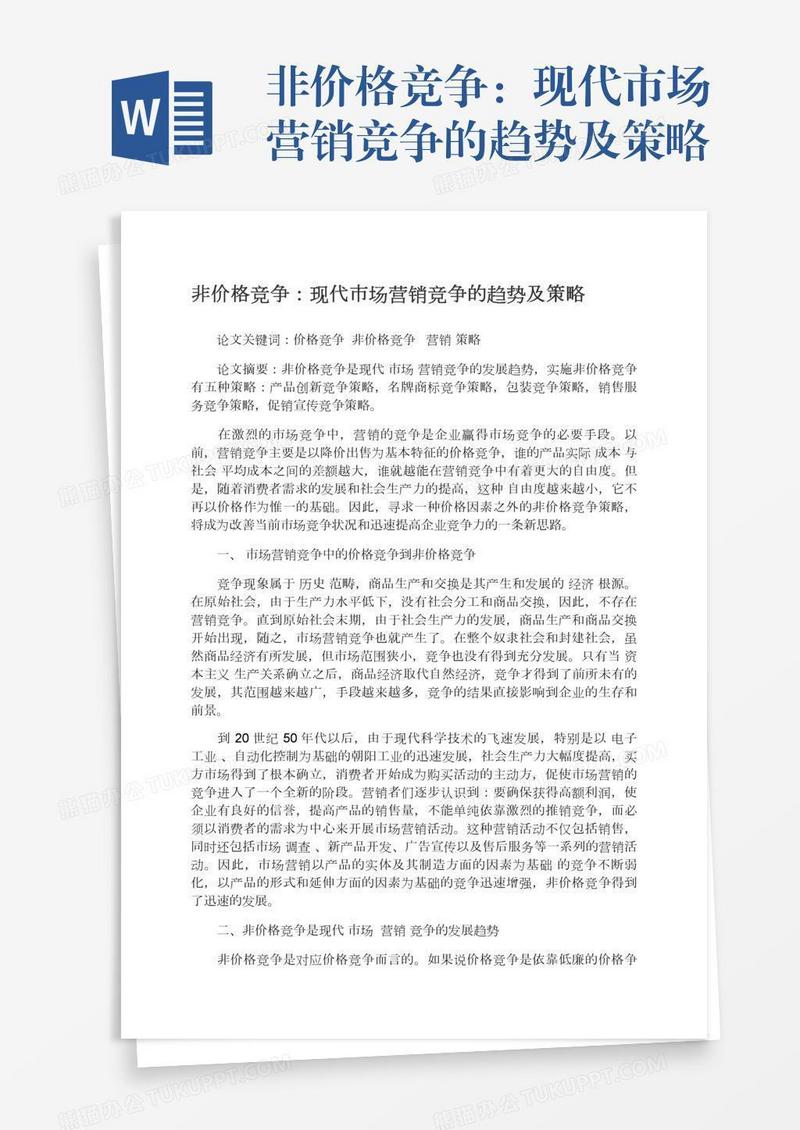 本作品为非价格竞争:现代市场营销竞争的趋势及策略, 编号:313ekobyg9, 格式为 docx, 大小1 MB, 本作品下载后,先解压,解压之后用推荐软件 Word(2010) 打开, 然后进行编辑功能。