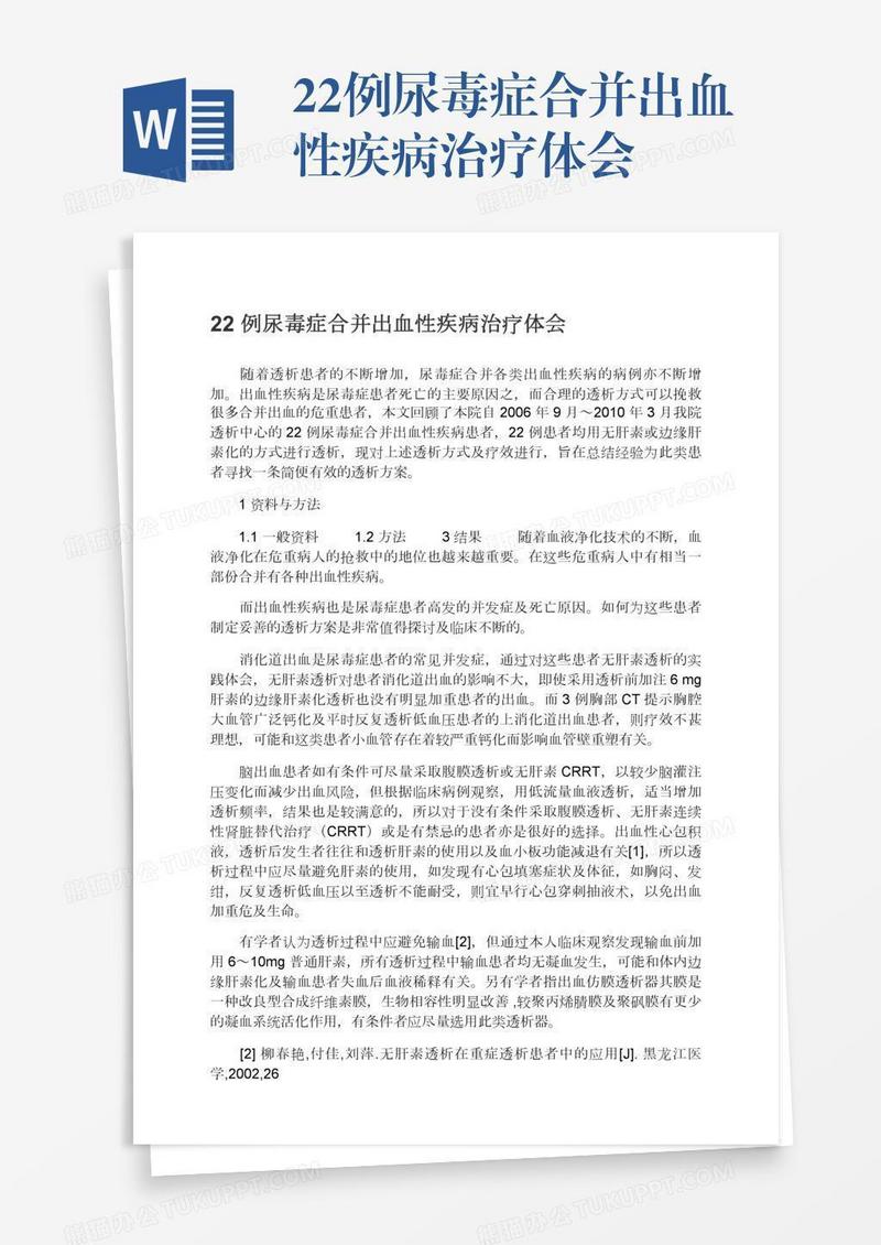 本作品为22例尿毒症合并出血性疾病治疗体会, 编号:313ekp6mp9, 格式为 docx, 大小1 MB, 本作品下载后,先解压,解压之后用推荐软件 Word(2010) 打开, 然后进行编辑功能。