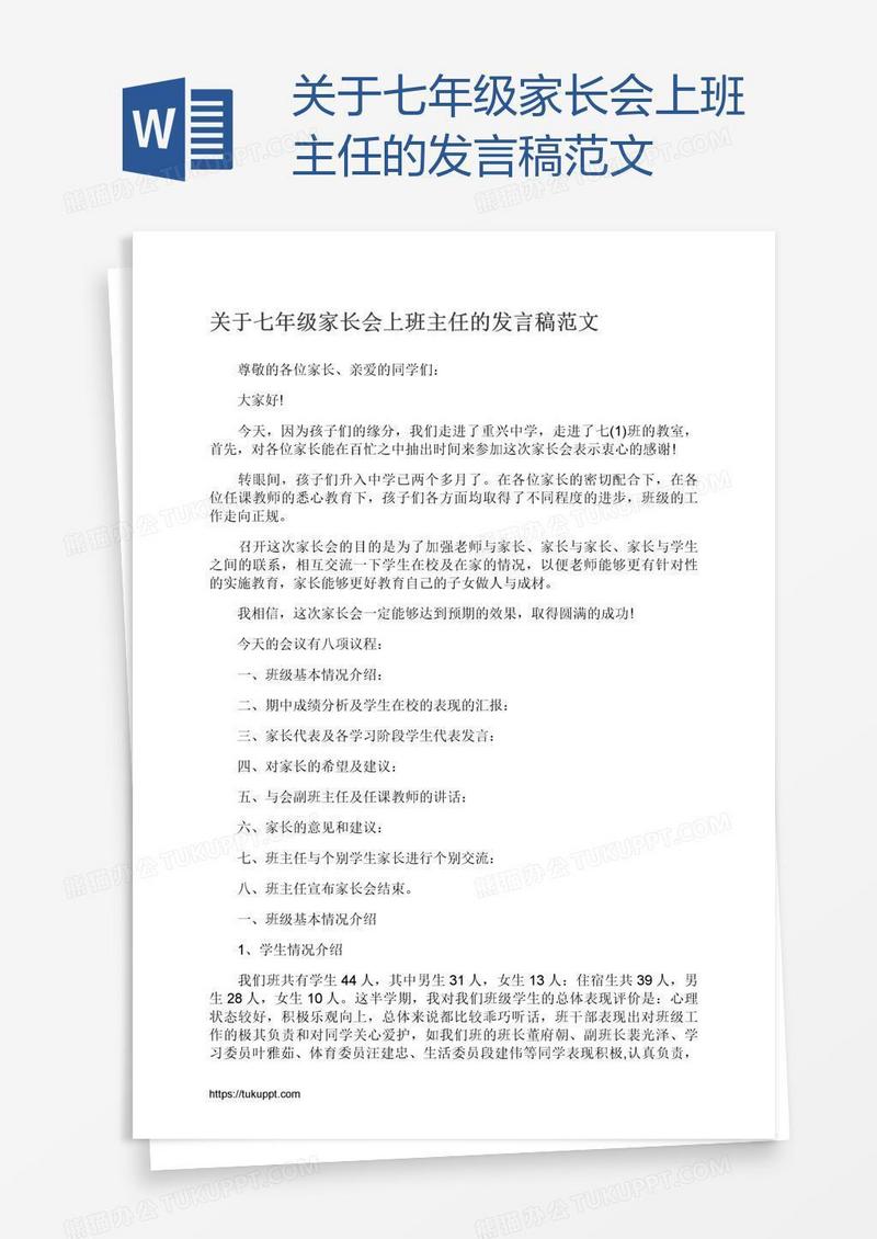 本作品为关于七年级家长会上班主任的发言稿范文, 编号:313ekq6pp9, 格式为 docx, 大小1 MB, 本作品下载后,先解压,解压之后用推荐软件 Word(2010) 打开, 然后进行编辑功能。
