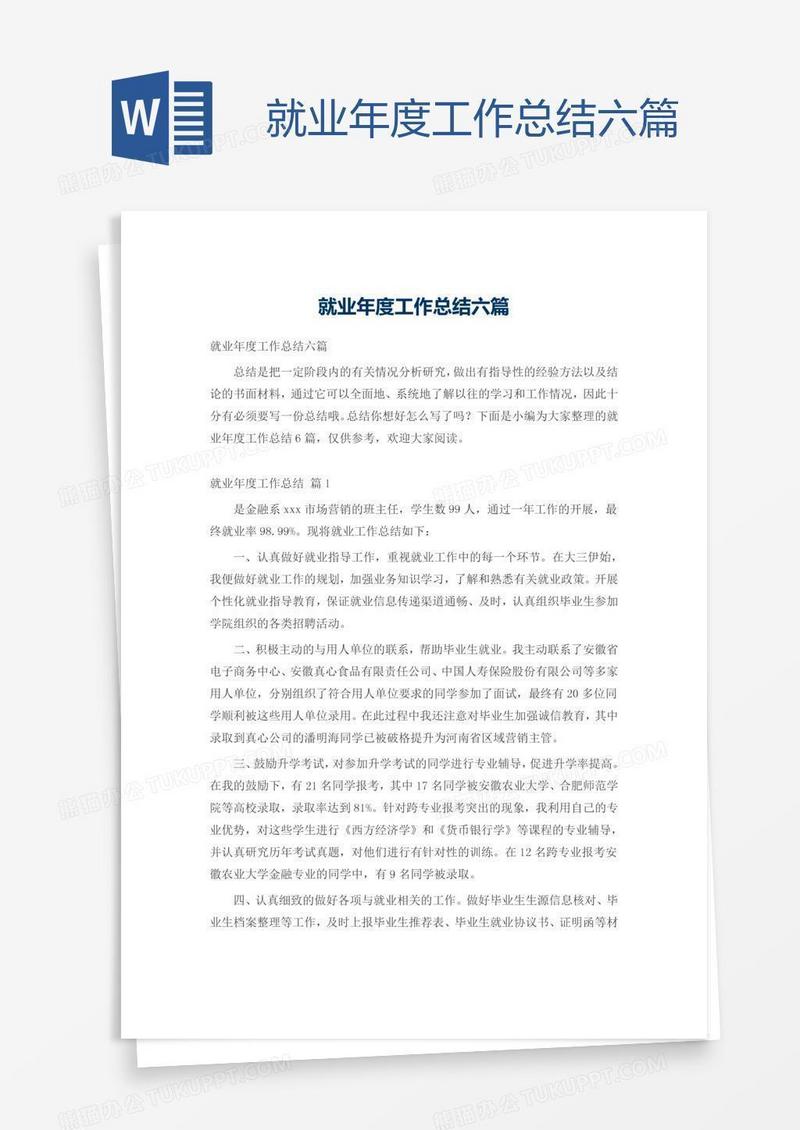 本作品为就业年度工作总结六篇, 编号:313ekrwog9, 格式为 doc, 大小1 MB, 本作品下载后,先解压,解压之后用推荐软件 Word(2010) 打开, 然后进行编辑功能。