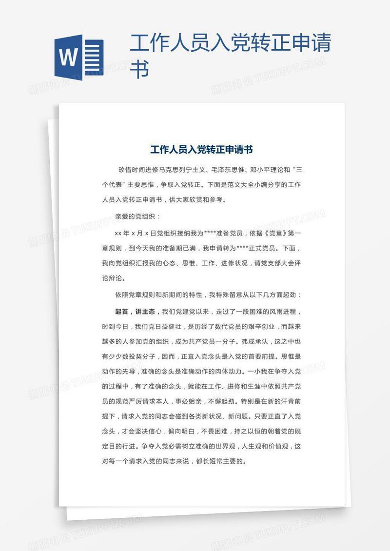 本作品为工作人员入党转正申请书, 编号:313ekv2mg9, 格式为 docx, 大小1 MB, 本作品下载后,先解压,解压之后用推荐软件 Word(2010) 打开, 然后进行编辑功能。
