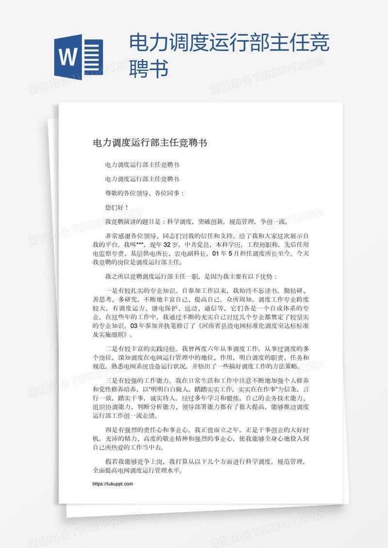 本作品为电力调度运行部主任竞聘书, 编号:313ekv4py9, 格式为 docx, 大小1 MB, 本作品下载后,先解压,解压之后用推荐软件 Word(2010) 打开, 然后进行编辑功能。