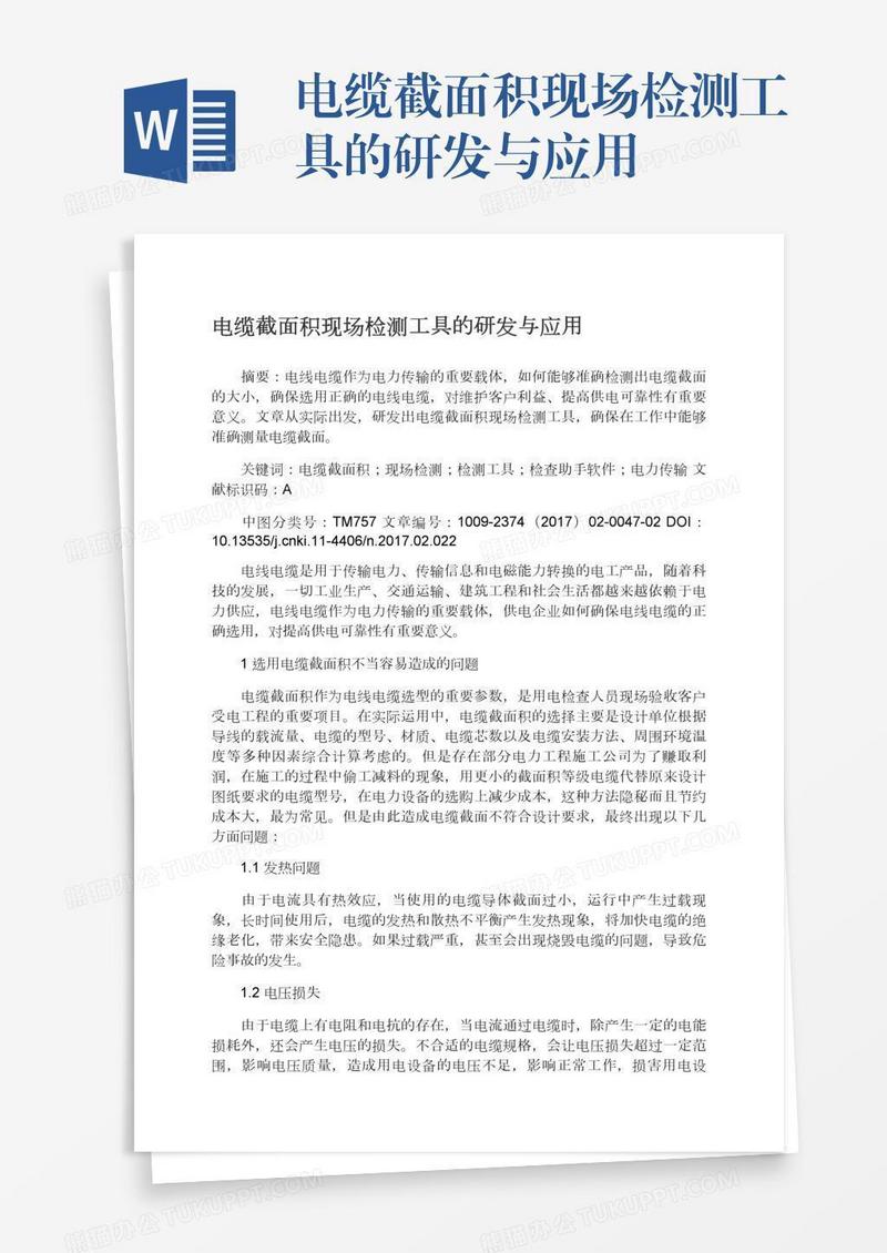 本作品为电缆截面积现场检测工具的研发与应用, 编号:313ekwo3g9, 格式为 docx, 大小1 MB, 本作品下载后,先解压,解压之后用推荐软件 Word(2010) 打开, 然后进行编辑功能。