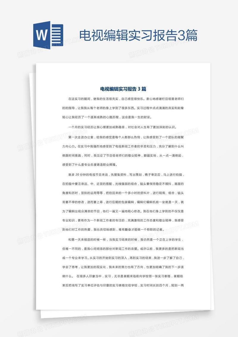 本作品为电视编辑实习报告3篇, 编号:313eky0369, 格式为 docx, 大小1 MB, 本作品下载后,先解压,解压之后用推荐软件 Word(2010) 打开, 然后进行编辑功能。