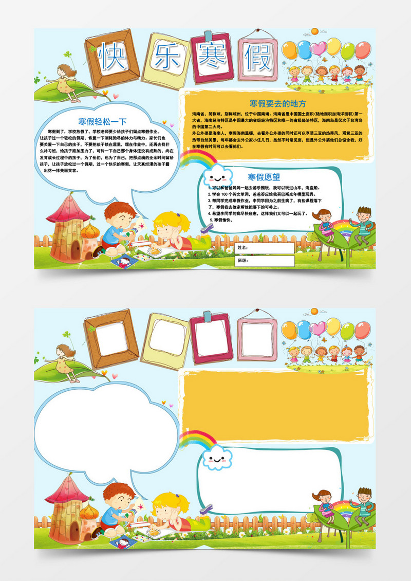 本作品为卡通可爱快乐寒假小报手抄报word模板, 编号:417p338g01, 格式为 wps, 大小5 MB, 本作品下载后,先解压,解压之后用推荐软件 Word(2016) 打开, 然后进行编辑功能。