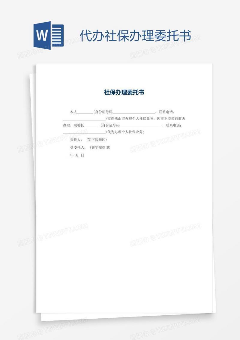 本作品为代办社保办理委托书, 编号:417p364y01, 格式为 docx, 大小1 MB, 本作品下载后,先解压,解压之后用推荐软件 Word(2010) 打开, 然后进行编辑功能。