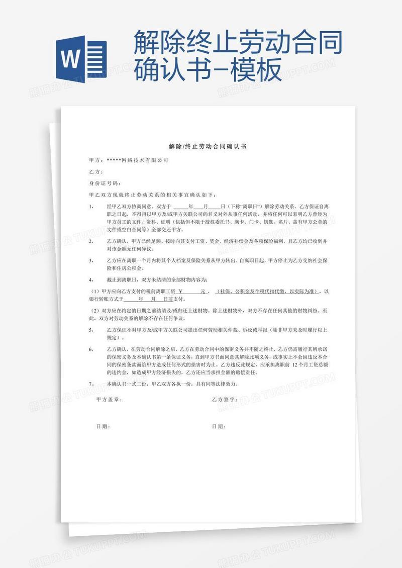 本作品为解除终止劳动合同确认书-模板, 编号:417p3q8vk1, 格式为 doc, 大小1 MB, 本作品下载后,先解压,解压之后用推荐软件 Word(2010) 打开, 然后进行编辑功能。