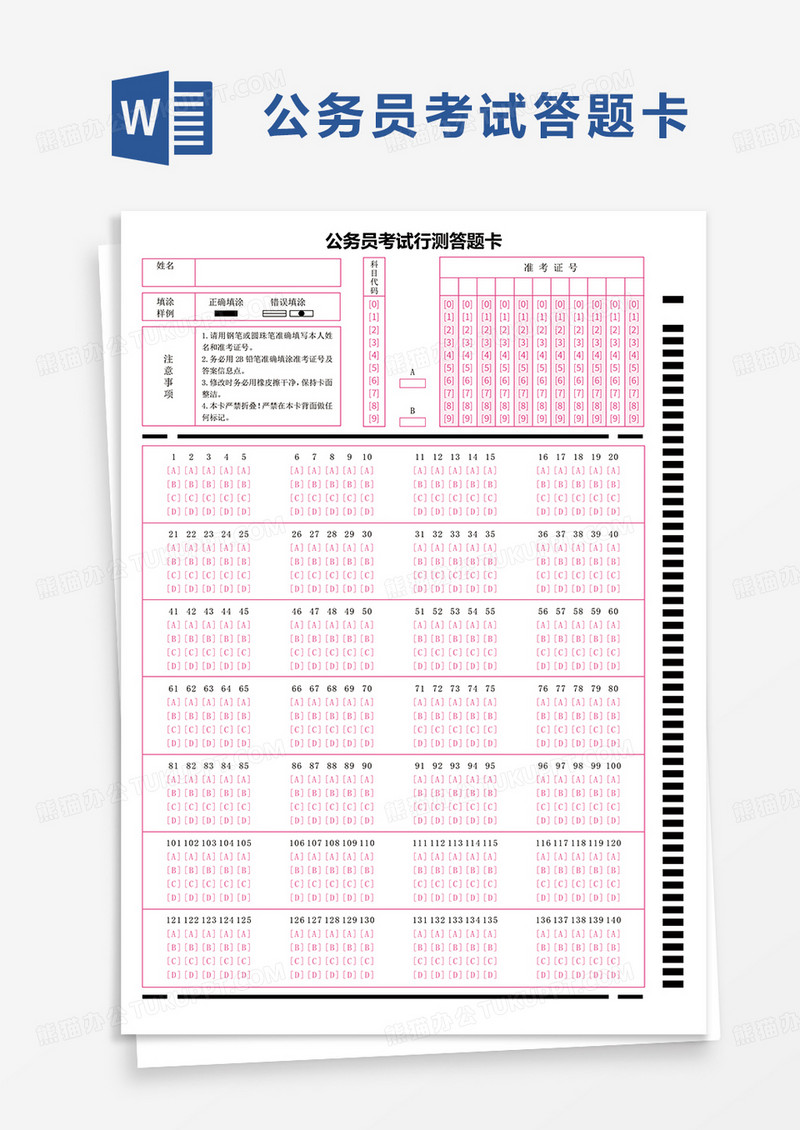本作品为公务员考试行测答题卡word模板, 编号:417p4g5g01, 格式为 docx, 大小3 MB, 本作品下载后,先解压,解压之后用推荐软件 Word(2019) 打开, 然后进行编辑功能。