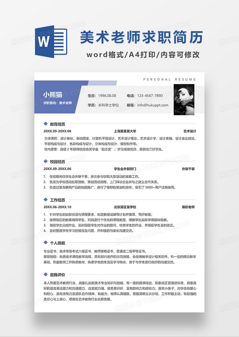 本作品为蓝色简约风美术老师求职简历WORD模板, 编号:417p4grk21, 格式为 docx, 大小3 MB, 本作品下载后,先解压,解压之后用推荐软件 Word(2019) 打开, 然后进行编辑功能。