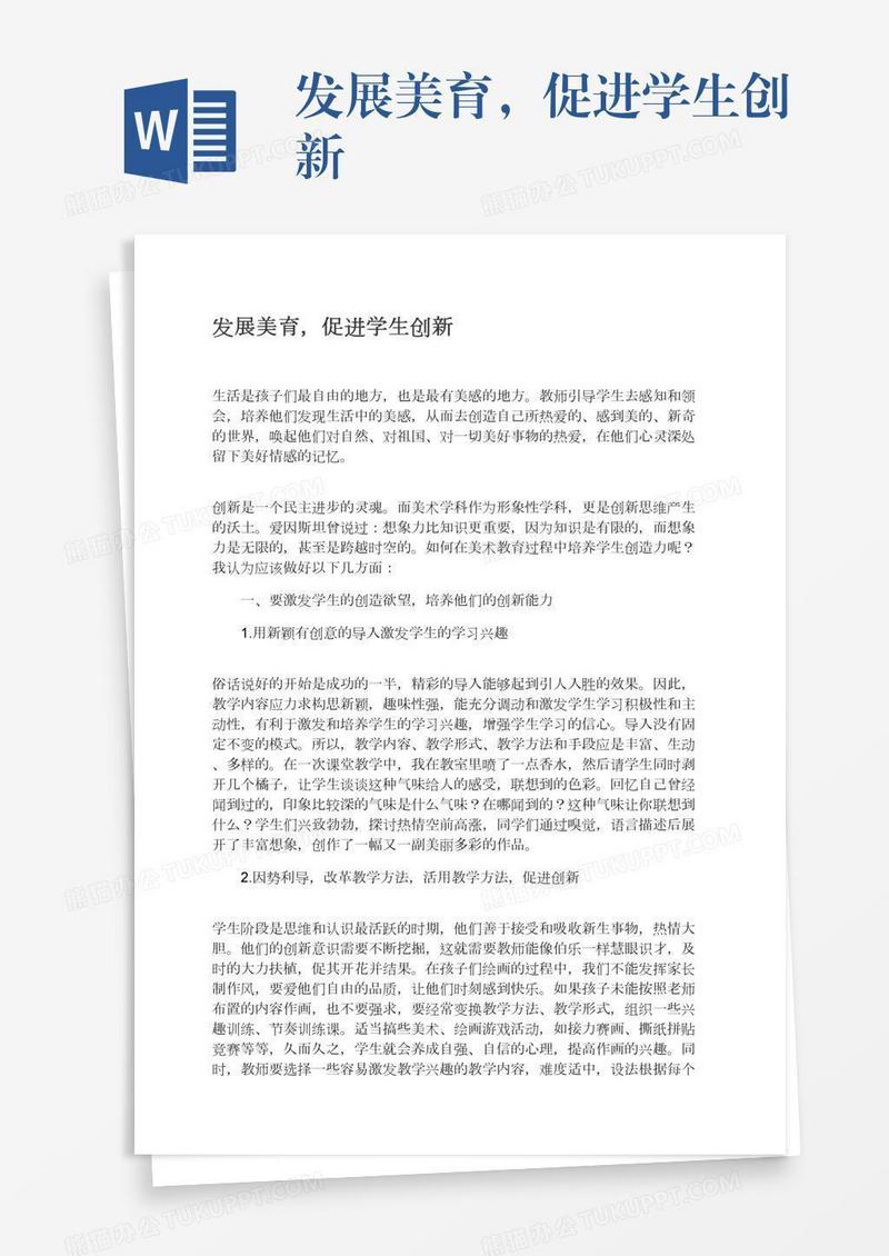 本作品为发展美育,促进学生创新, 编号:417p4jwv01, 格式为 docx, 大小1 MB, 本作品下载后,先解压,解压之后用推荐软件 Word(2010) 打开, 然后进行编辑功能。