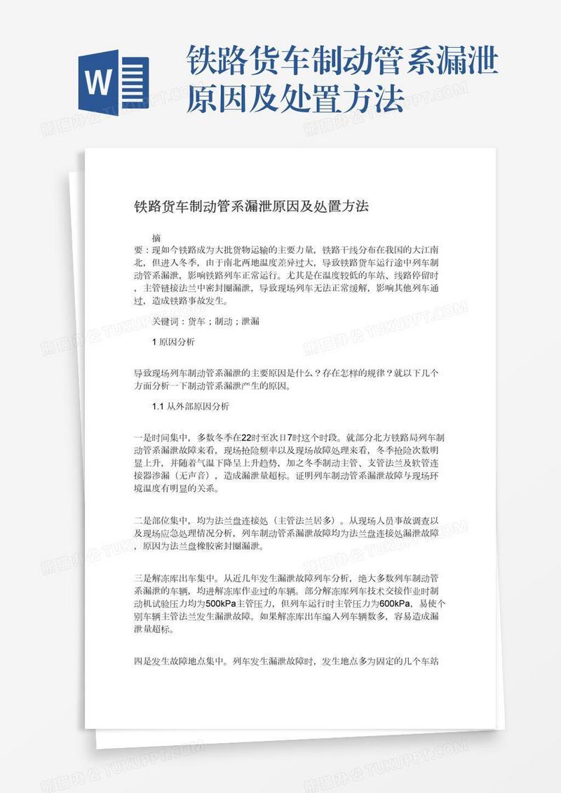 本作品为铁路货车制动管系漏泄原因及处置方法, 编号:417p4o8n61, 格式为 docx, 大小1 MB, 本作品下载后,先解压,解压之后用推荐软件 Word(2010) 打开, 然后进行编辑功能。