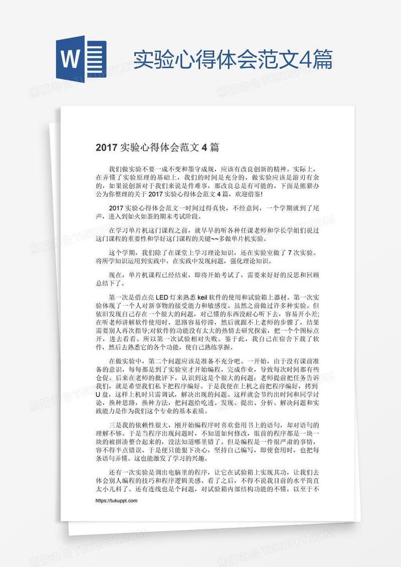 本作品为实验心得体会范文4篇, 编号:417py0j8k1, 格式为 docx, 大小1 MB, 本作品下载后,先解压,解压之后用推荐软件 Word(2010) 打开, 然后进行编辑功能。