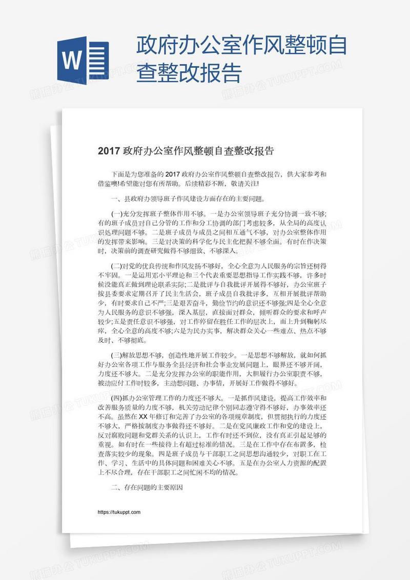 本作品为政府办公室作风整顿自查整改报告, 编号:417py3l721, 格式为 docx, 大小1 MB, 本作品下载后,先解压,解压之后用推荐软件 Word(2010) 打开, 然后进行编辑功能。