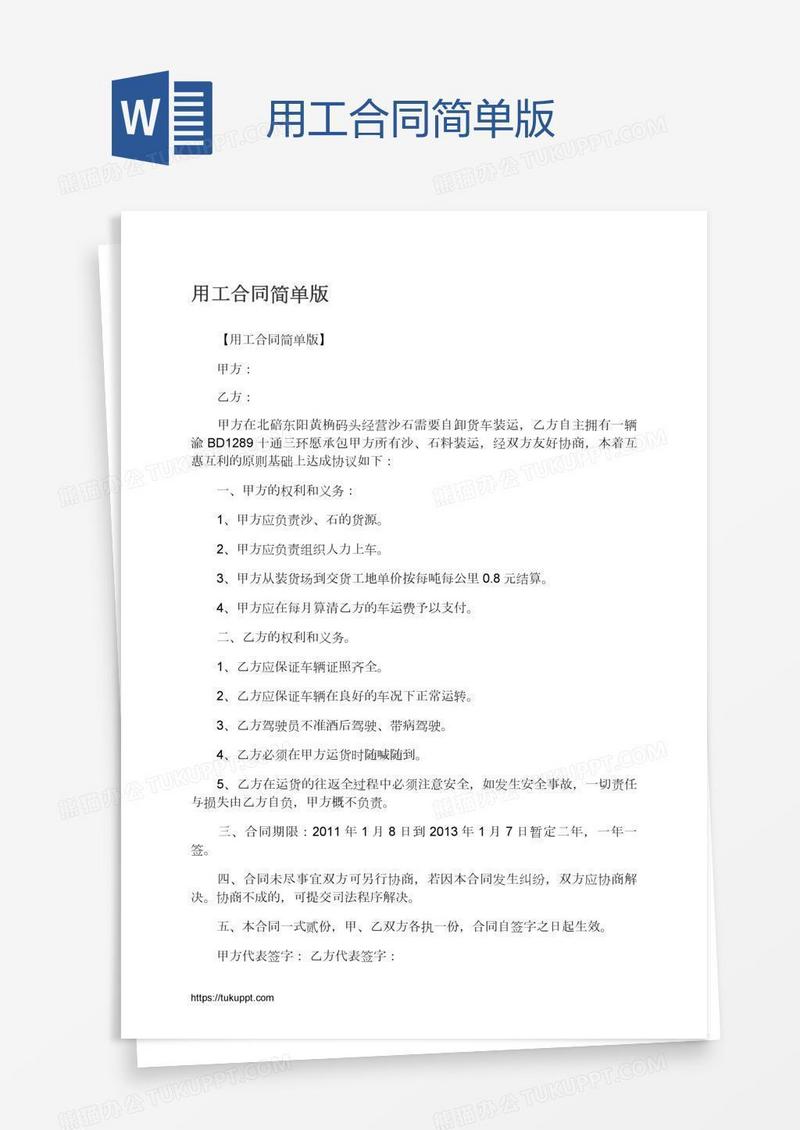 本作品为用工合同简单版, 编号:417py3p621, 格式为 docx, 大小1 MB, 本作品下载后,先解压,解压之后用推荐软件 Word(2010) 打开, 然后进行编辑功能。