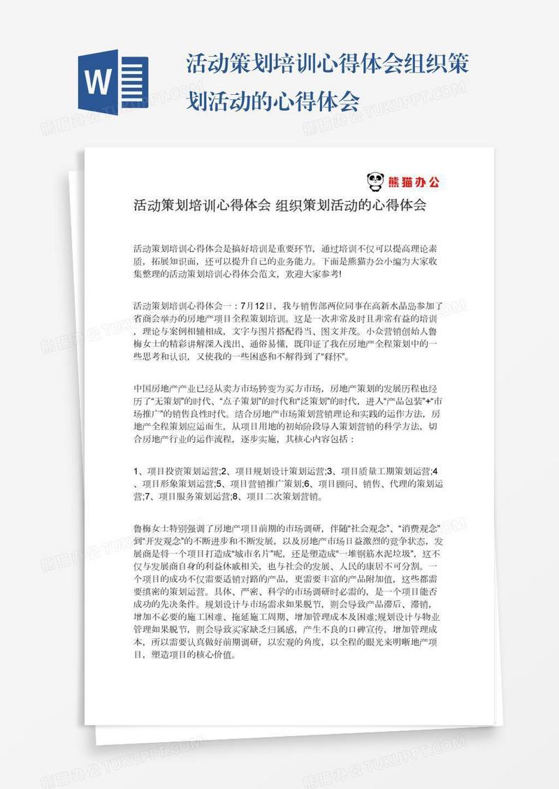 本作品为活动策划培训心得体会组织策划活动的心得体会, 编号:417py8my61, 格式为 docx, 大小1 MB, 本作品下载后,先解压,解压之后用推荐软件 Word(2010) 打开, 然后进行编辑功能。