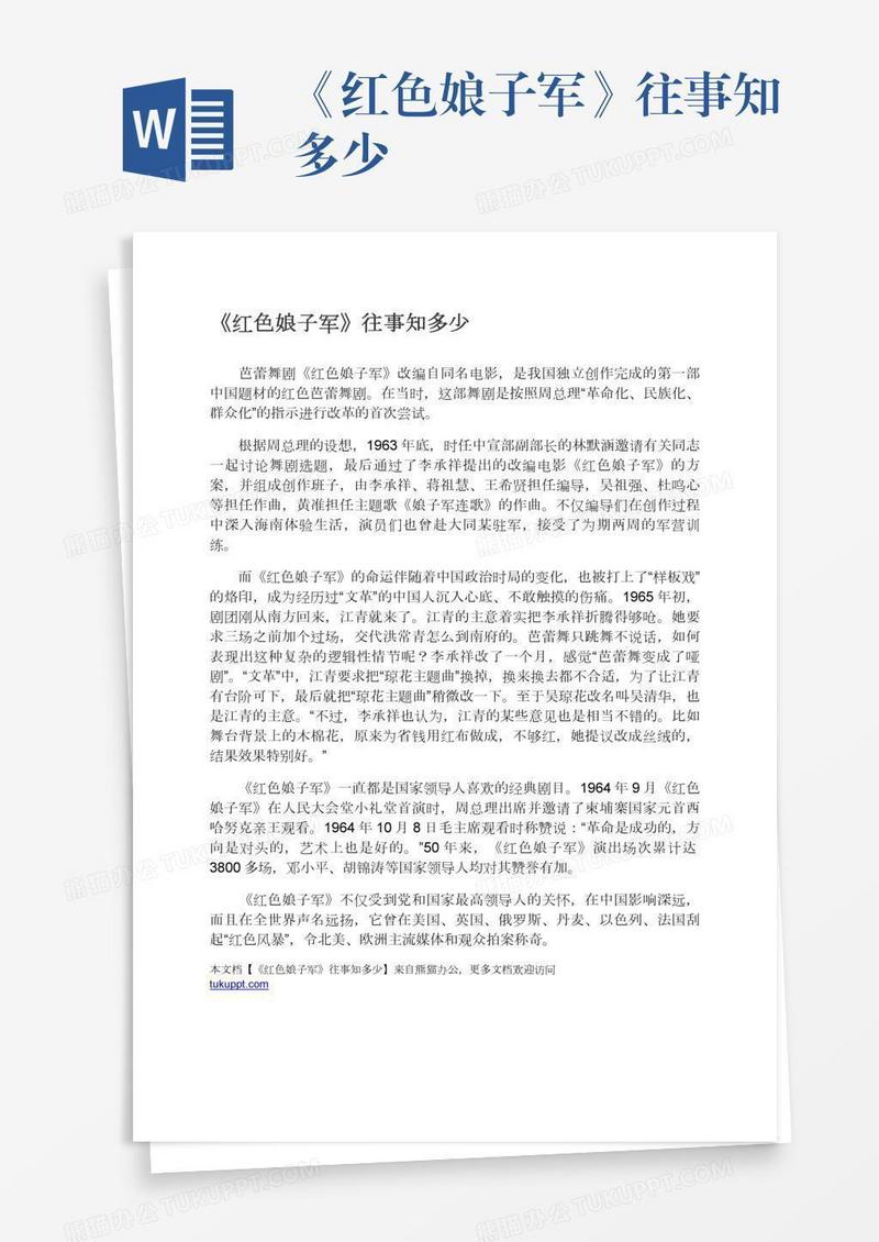 本作品为《红色娘子军》往事知多少, 编号:417pyed8k1, 格式为 docx, 大小1 MB, 本作品下载后,先解压,解压之后用推荐软件 Word(2010) 打开, 然后进行编辑功能。