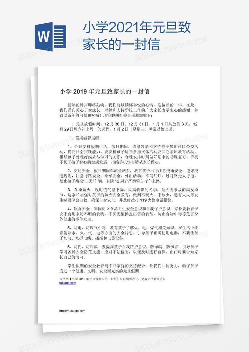 本作品为小学2021年元旦致家长的一封信, 编号:417pyjm331, 格式为 docx, 大小1 MB, 本作品下载后,先解压,解压之后用推荐软件 Word(2010) 打开, 然后进行编辑功能。