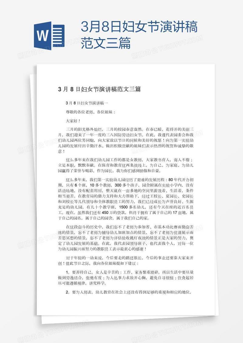 本作品为3月8日妇女节演讲稿范文三篇, 编号:417pyjnw61, 格式为 docx, 大小1 MB, 本作品下载后,先解压,解压之后用推荐软件 Word(2010) 打开, 然后进行编辑功能。