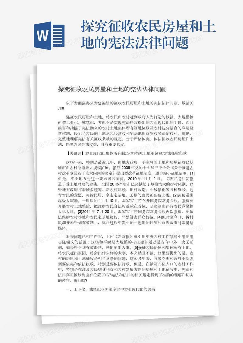 本作品为探究征收农民房屋和土地的宪法法律问题, 编号:417pym5j61, 格式为 docx, 大小1 MB, 本作品下载后,先解压,解压之后用推荐软件 Word(2010) 打开, 然后进行编辑功能。