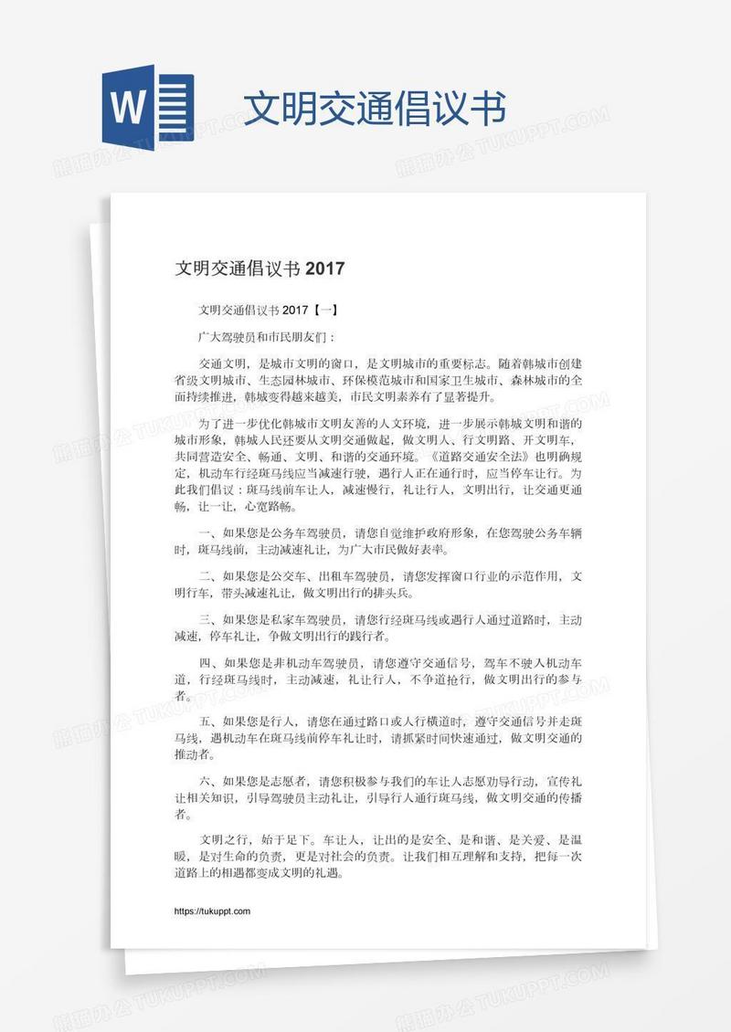 本作品为文明交通倡议书, 编号:417pypem61, 格式为 docx, 大小1 MB, 本作品下载后,先解压,解压之后用推荐软件 Word(2010) 打开, 然后进行编辑功能。