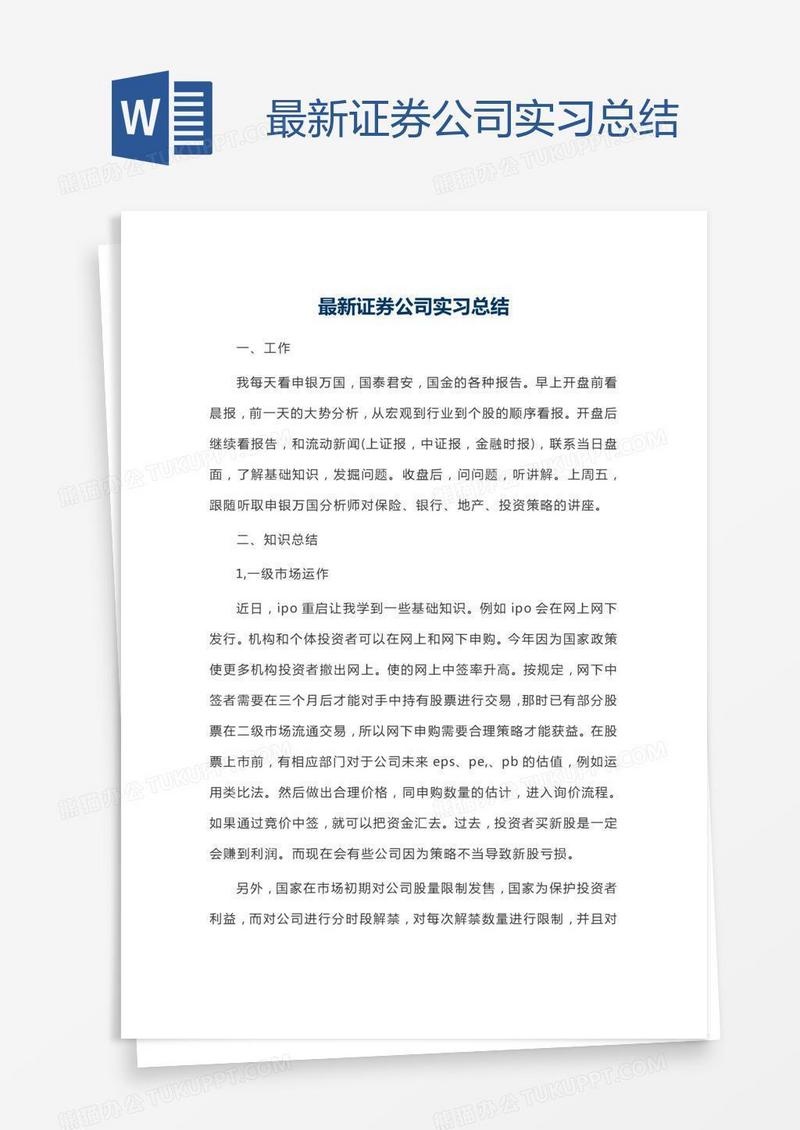 本作品为最新证券公司实习总结, 编号:417pyqv821, 格式为 docx, 大小1 MB, 本作品下载后,先解压,解压之后用推荐软件 Word(2010) 打开, 然后进行编辑功能。
