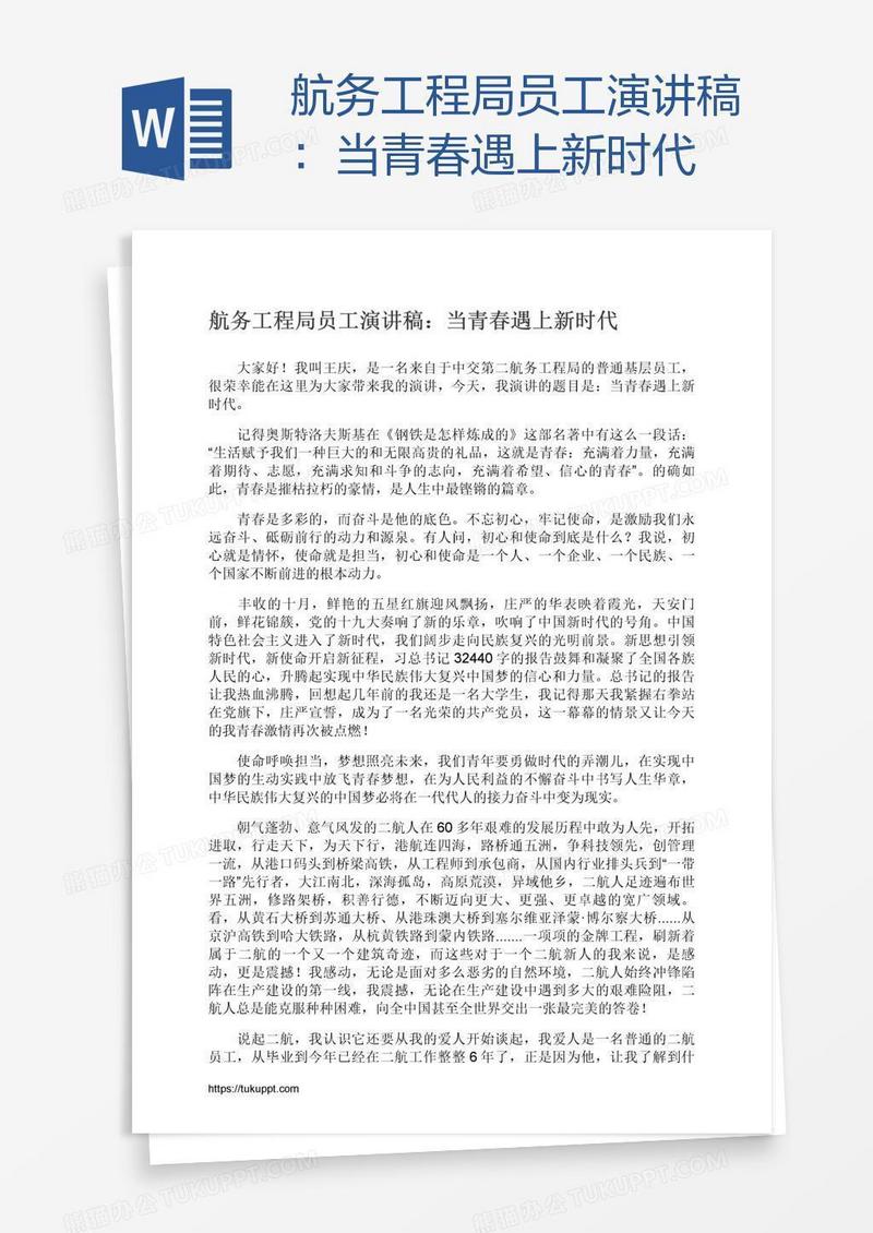 本作品为航务工程局员工演讲稿:当青春遇上新时代, 编号:417pyvbm21, 格式为 docx, 大小1 MB, 本作品下载后,先解压,解压之后用推荐软件 Word(2010) 打开, 然后进行编辑功能。