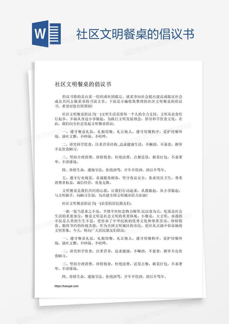 本作品为社区文明餐桌的倡议书, 编号:417pyvdgk1, 格式为 docx, 大小1 MB, 本作品下载后,先解压,解压之后用推荐软件 Word(2010) 打开, 然后进行编辑功能。