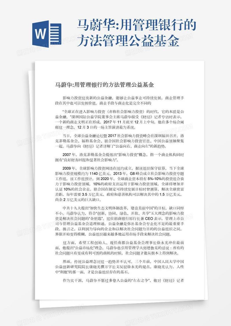 本作品为马蔚华:用管理银行的方法管理公益基金, 编号:417pywm231, 格式为 docx, 大小1 MB, 本作品下载后,先解压,解压之后用推荐软件 Word(2010) 打开, 然后进行编辑功能。