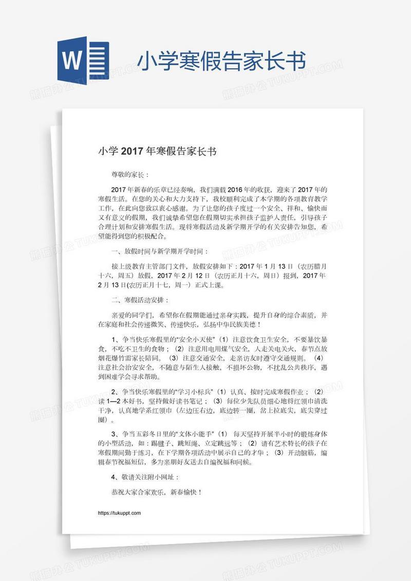本作品为小学寒假告家长书, 编号:417pyy55k1, 格式为 docx, 大小1 MB, 本作品下载后,先解压,解压之后用推荐软件 Word(2010) 打开, 然后进行编辑功能。