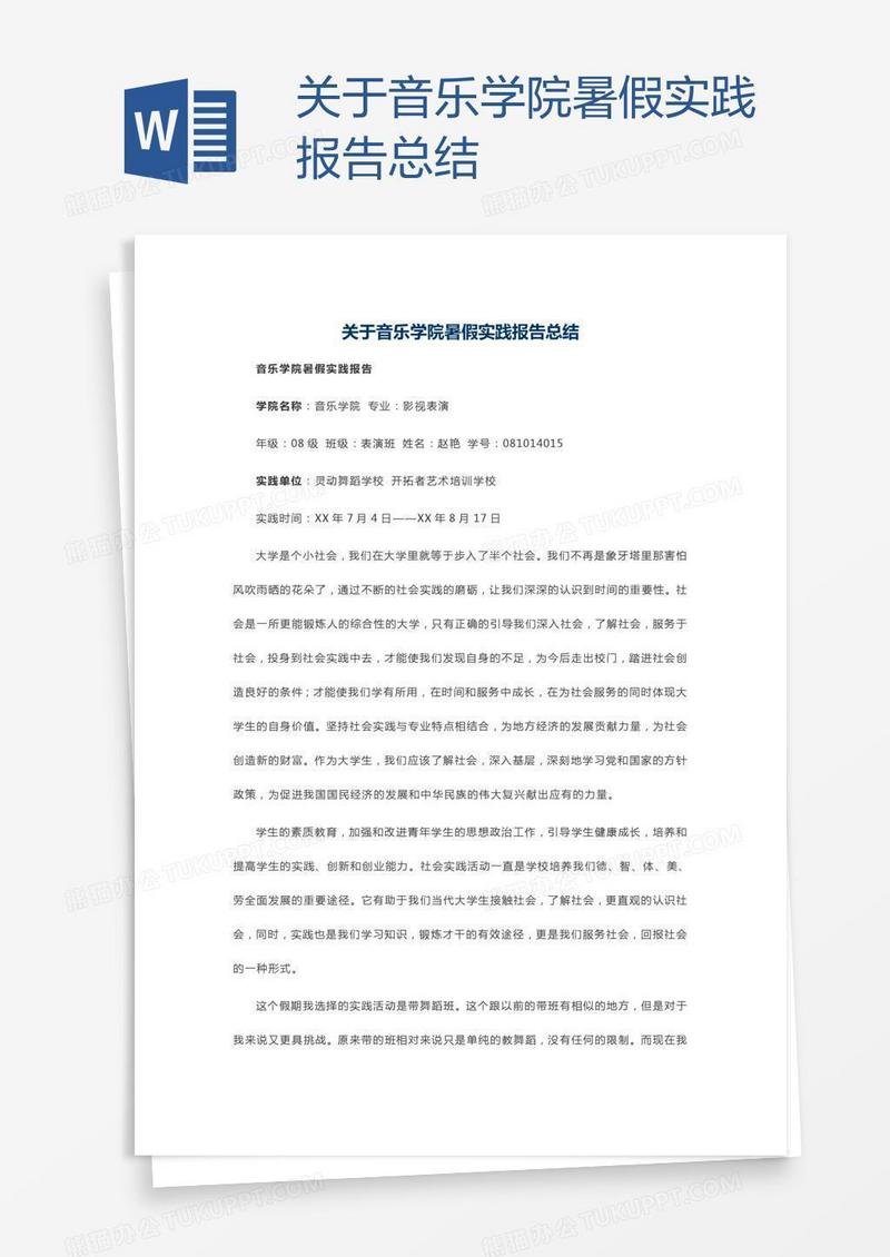 本作品为关于音乐学院暑假实践报告总结, 编号:417pyybe21, 格式为 doc, 大小1 MB, 本作品下载后,先解压,解压之后用推荐软件 Word(2010) 打开, 然后进行编辑功能。
