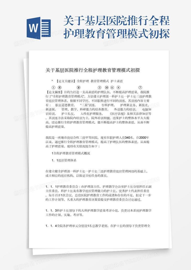 本作品为关于基层医院推行全程护理教育管理模式初探, 编号:510jg2q6ja, 格式为 docx, 大小1 MB, 本作品下载后,先解压,解压之后用推荐软件 Word(2010) 打开, 然后进行编辑功能。