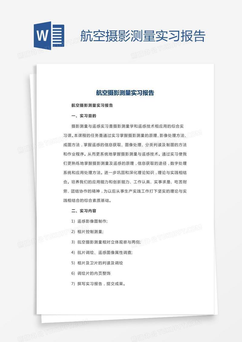 本作品为航空摄影测量实习报告, 编号:510jg30v7a, 格式为 docx, 大小1 MB, 本作品下载后,先解压,解压之后用推荐软件 Word(2010) 打开, 然后进行编辑功能。