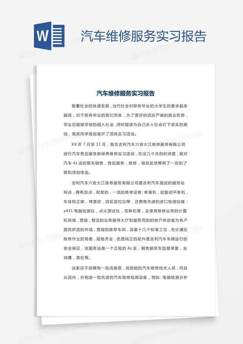 本作品为汽车维修服务实习报告, 编号:510jg3l7ea, 格式为 docx, 大小1 MB, 本作品下载后,先解压,解压之后用推荐软件 Word(2010) 打开, 然后进行编辑功能。