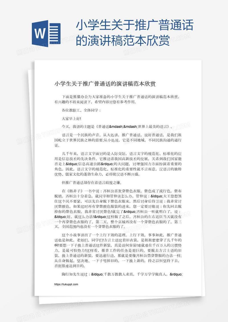 本作品为小学生关于推广普通话的演讲稿范本欣赏, 编号:510jg5erja, 格式为 docx, 大小1 MB, 本作品下载后,先解压,解压之后用推荐软件 Word(2010) 打开, 然后进行编辑功能。