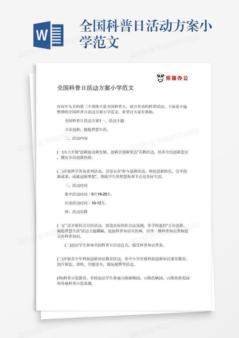 本作品为全国科普日活动方案小学范文, 编号:510jg62wea, 格式为 docx, 大小1 MB, 本作品下载后,先解压,解压之后用推荐软件 Word(2010) 打开, 然后进行编辑功能。