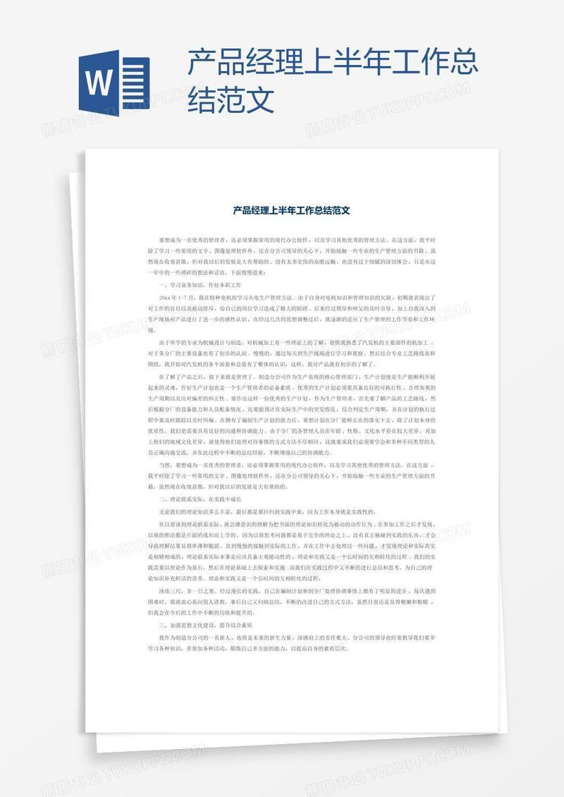 本作品为产品经理上半年工作总结范文, 编号:510jgd047a, 格式为 doc, 大小1 MB, 本作品下载后,先解压,解压之后用推荐软件 Word(2010) 打开, 然后进行编辑功能。