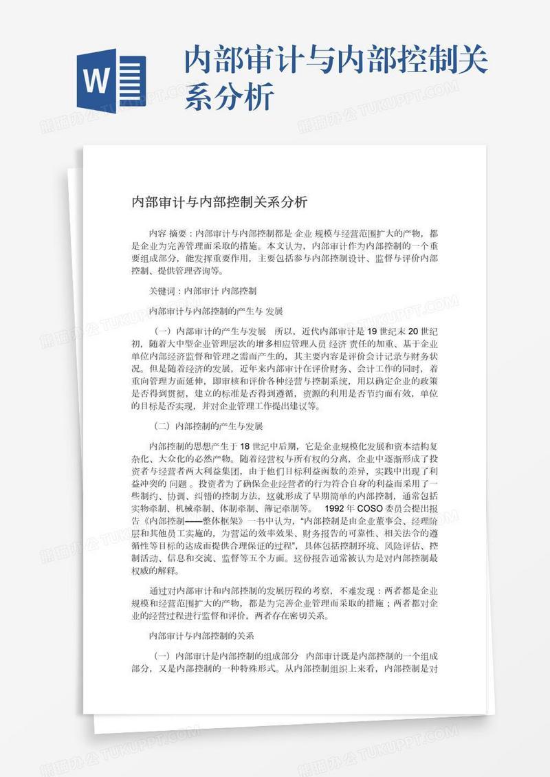 本作品为内部审计与内部控制关系分析, 编号:510jgk537a, 格式为 docx, 大小1 MB, 本作品下载后,先解压,解压之后用推荐软件 Word(2010) 打开, 然后进行编辑功能。