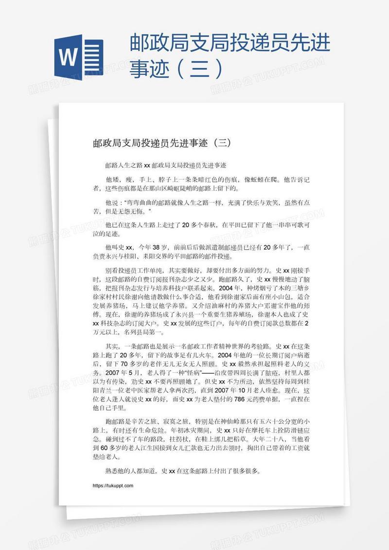 本作品为邮政局支局投递员先进事迹(三), 编号:510jglr28a, 格式为 docx, 大小1 MB, 本作品下载后,先解压,解压之后用推荐软件 Word(2010) 打开, 然后进行编辑功能。