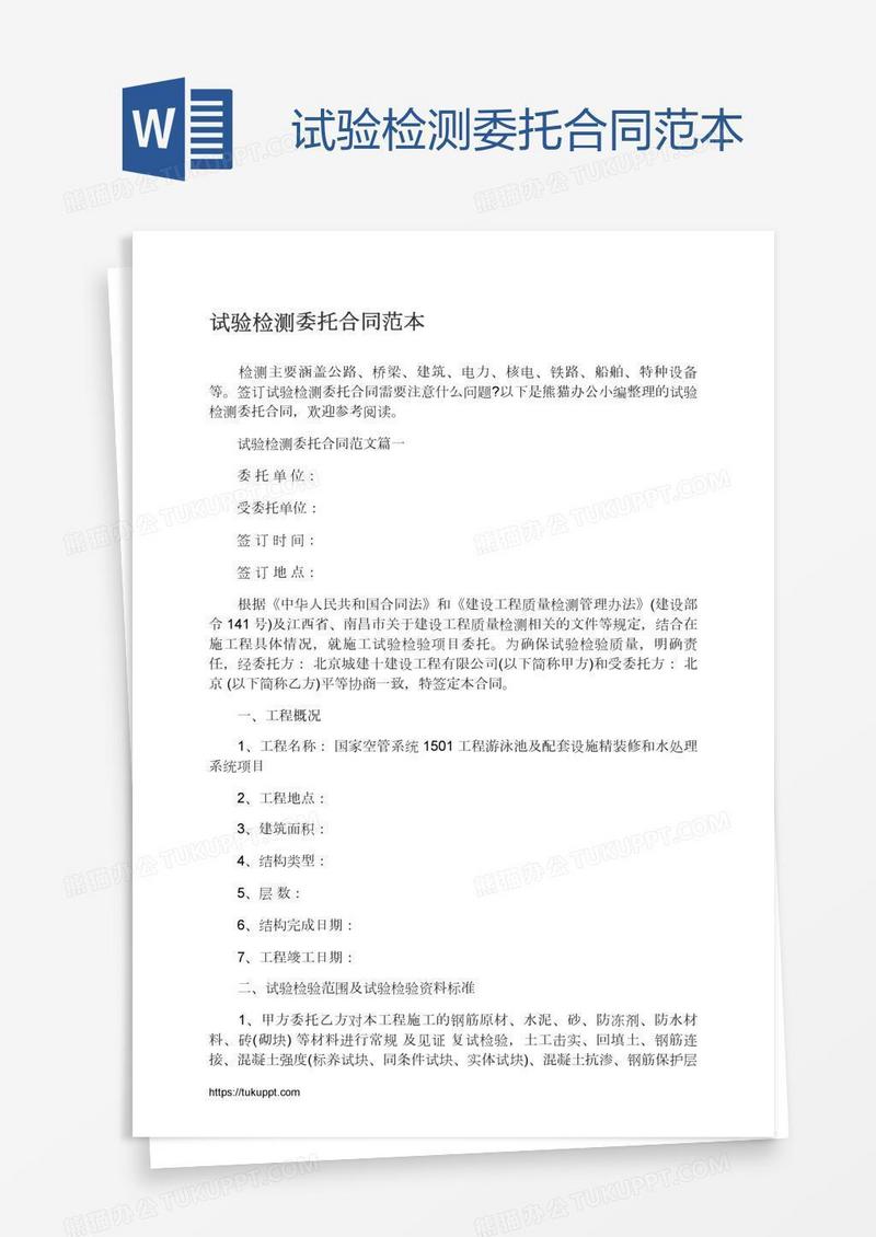 本作品为试验检测委托合同范本, 编号:510jgnp8ra, 格式为 docx, 大小1 MB, 本作品下载后,先解压,解压之后用推荐软件 Word(2010) 打开, 然后进行编辑功能。