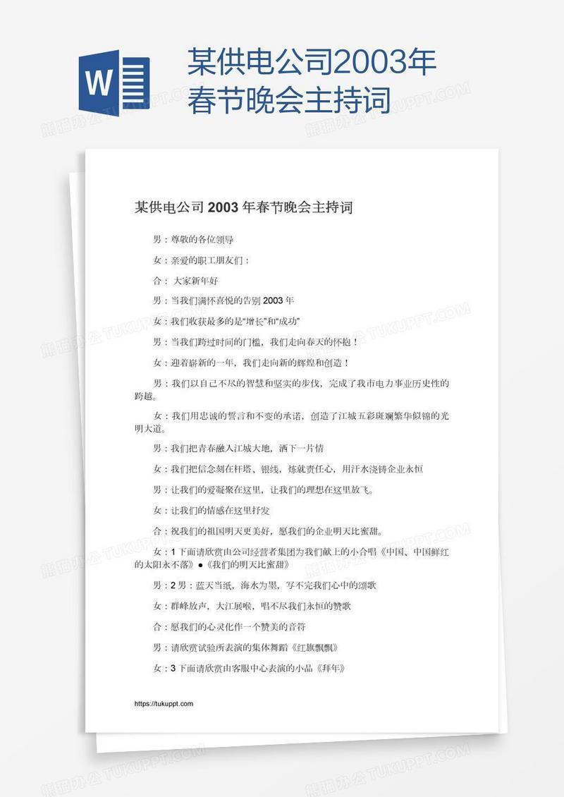 本作品为某供电公司2003年春节晚会主持词, 编号:510jgp4yja, 格式为 docx, 大小1 MB, 本作品下载后,先解压,解压之后用推荐软件 Word(2010) 打开, 然后进行编辑功能。