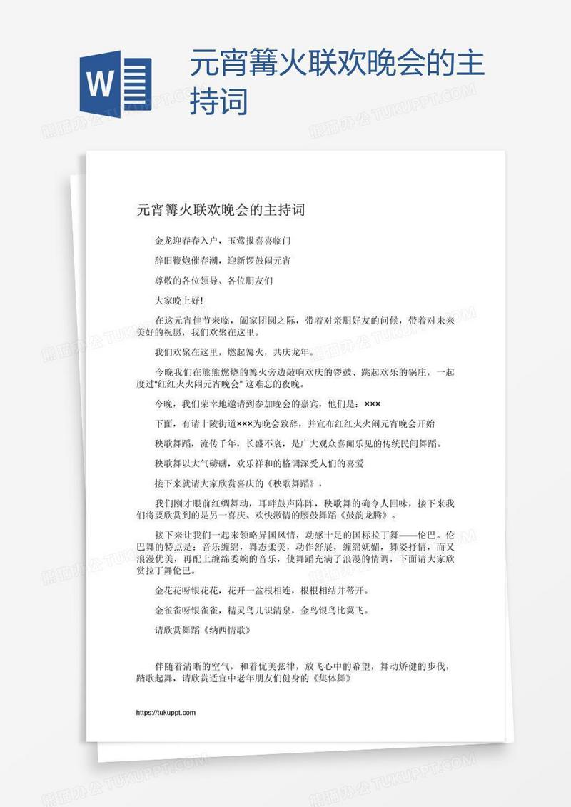 本作品为元宵篝火联欢晚会的主持词, 编号:510jgqpqva, 格式为 docx, 大小1 MB, 本作品下载后,先解压,解压之后用推荐软件 Word(2010) 打开, 然后进行编辑功能。