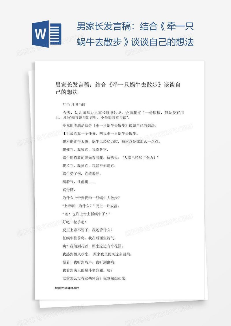 本作品为男家长发言稿:结合《牵一只蜗牛去散步》谈谈自己的想法, 编号:510jgqvqva, 格式为 docx, 大小1 MB, 本作品下载后,先解压,解压之后用推荐软件 Word(2010) 打开, 然后进行编辑功能。