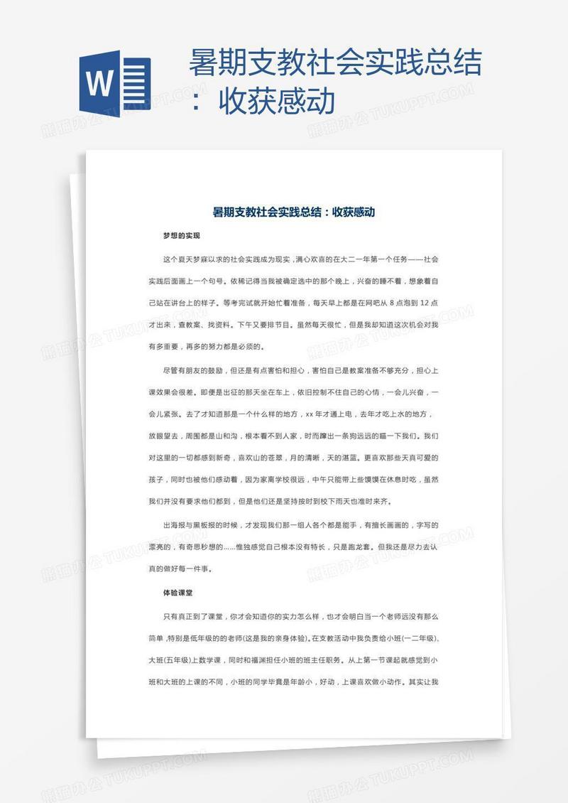 本作品为暑期支教社会实践总结:收获感动, 编号:510jgrwp7a, 格式为 doc, 大小1 MB, 本作品下载后,先解压,解压之后用推荐软件 Word(2010) 打开, 然后进行编辑功能。