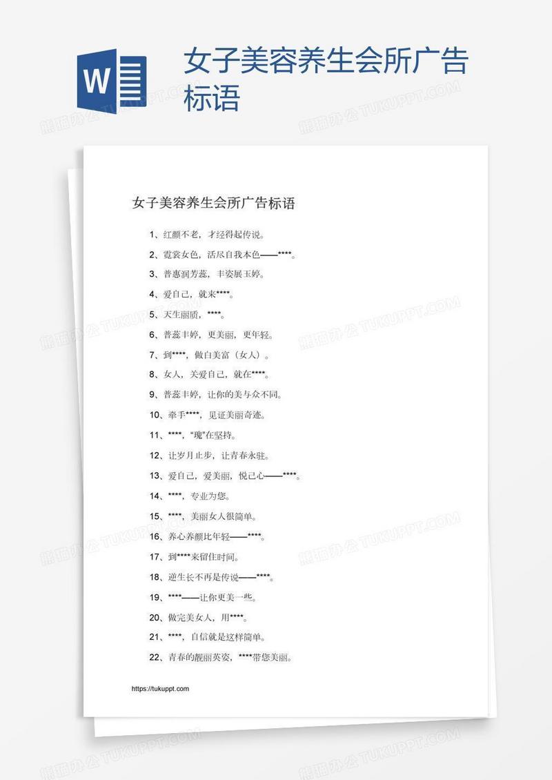 本作品为女子美容养生会所广告标语, 编号:510jgyblea, 格式为 docx, 大小1 MB, 本作品下载后,先解压,解压之后用推荐软件 Word(2010) 打开, 然后进行编辑功能。