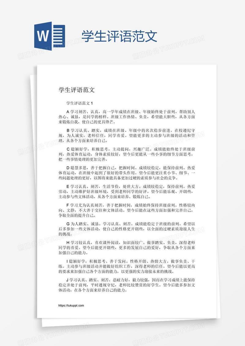 本作品为学生评语范文, 编号:510jo2eeva, 格式为 docx, 大小1 MB, 本作品下载后,先解压,解压之后用推荐软件 Word(2010) 打开, 然后进行编辑功能。