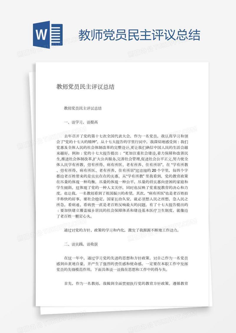 本作品为教师党员民主评议总结, 编号:510jo63y8a, 格式为 docx, 大小1 MB, 本作品下载后,先解压,解压之后用推荐软件 Word(2010) 打开, 然后进行编辑功能。