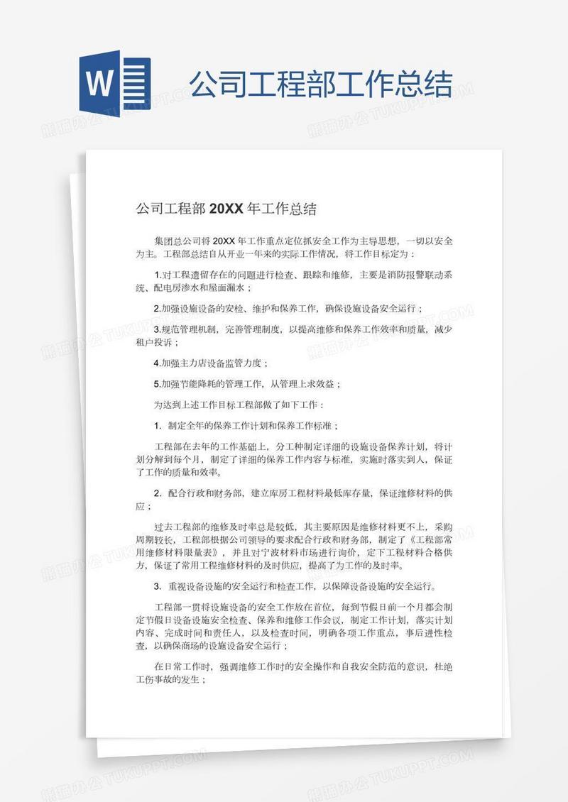 本作品为公司工程部工作总结, 编号:510jo6p4ja, 格式为 docx, 大小1 MB, 本作品下载后,先解压,解压之后用推荐软件 Word(2010) 打开, 然后进行编辑功能。