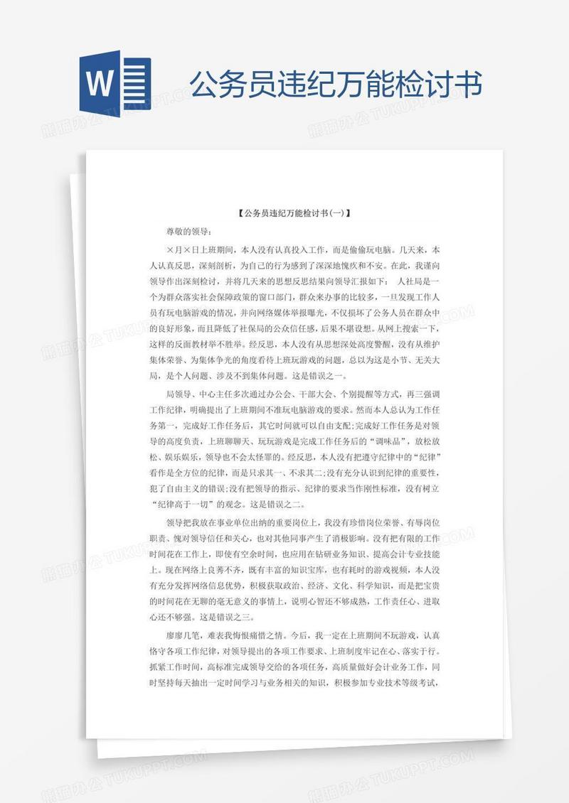 本作品为公务员违纪万能检讨书, 编号:510jobwkra, 格式为 doc, 大小1 MB, 本作品下载后,先解压,解压之后用推荐软件 Word(2010) 打开, 然后进行编辑功能。