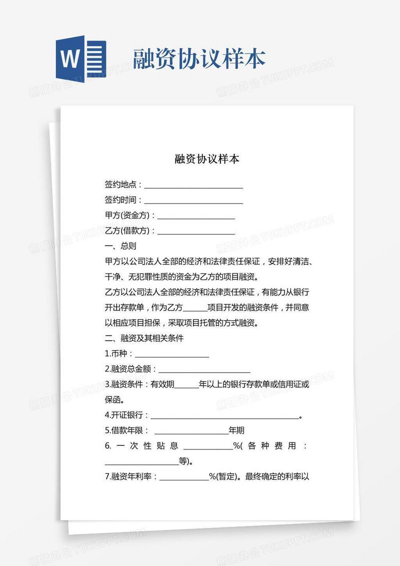 本作品为融资协议样本, 编号:510jr4dm7a, 格式为 docx, 大小1 MB, 本作品下载后,先解压,解压之后用推荐软件 Word(2010) 打开, 然后进行编辑功能。